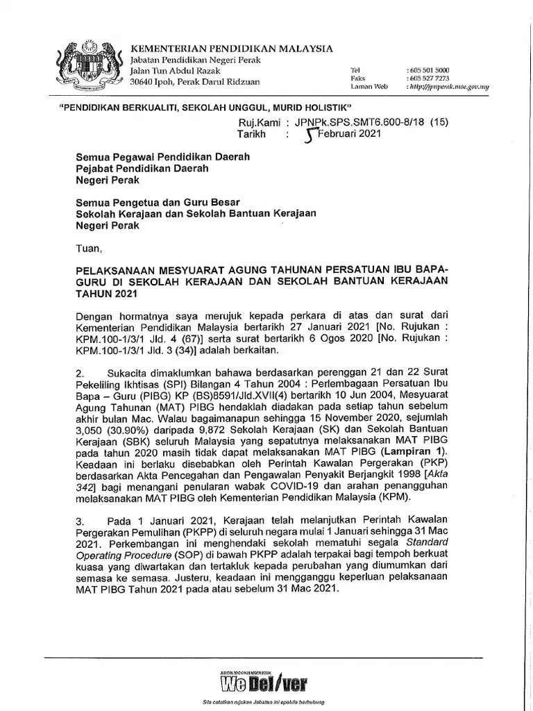 Pengumuman notis mesyuarat agung kawasan dan pemilihan. Contoh surat permohonan mesyuarat agung pibg. Posted by smk puteri titiwangsa at 7:00 pg. Contoh format surat penangguhan mat pibg 2021 by hyukillarisha. Penangguhan pelaksanaan mesyuarat agung tahunan tahun 2020 bagi badan sukan yang berdaftar di bawah akta pembangunan sukan 1997 .